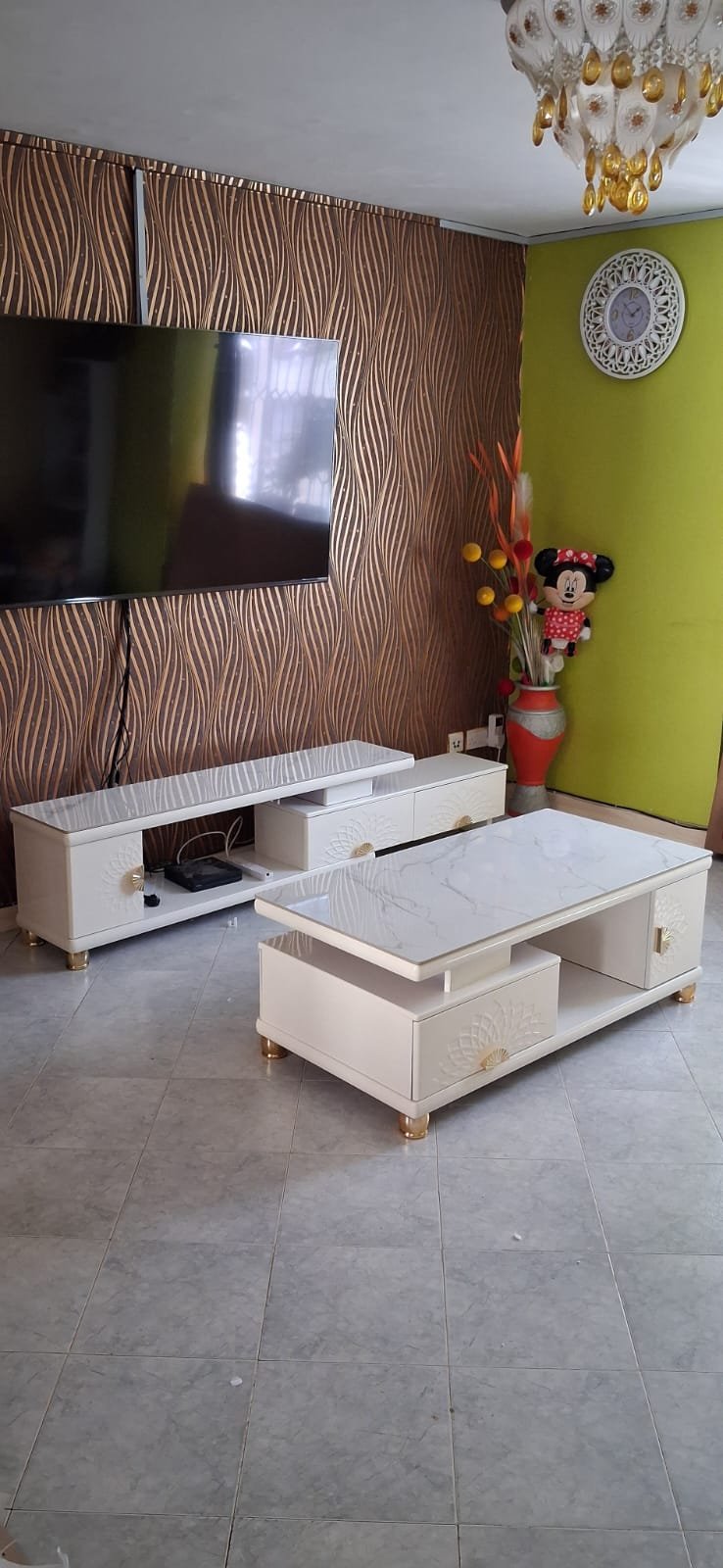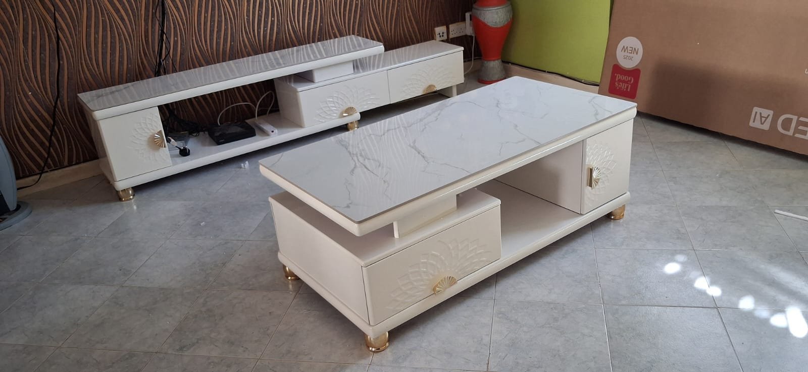 Marble-top coffee table + TV stand set available now.