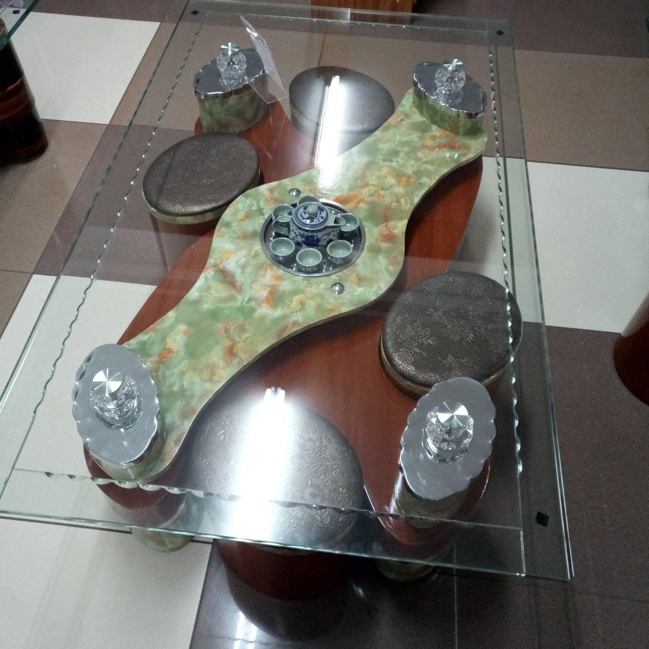 This stunning coffee table set with four stools is the perfect addition to create a stylish and functional centerpiece in your living space.